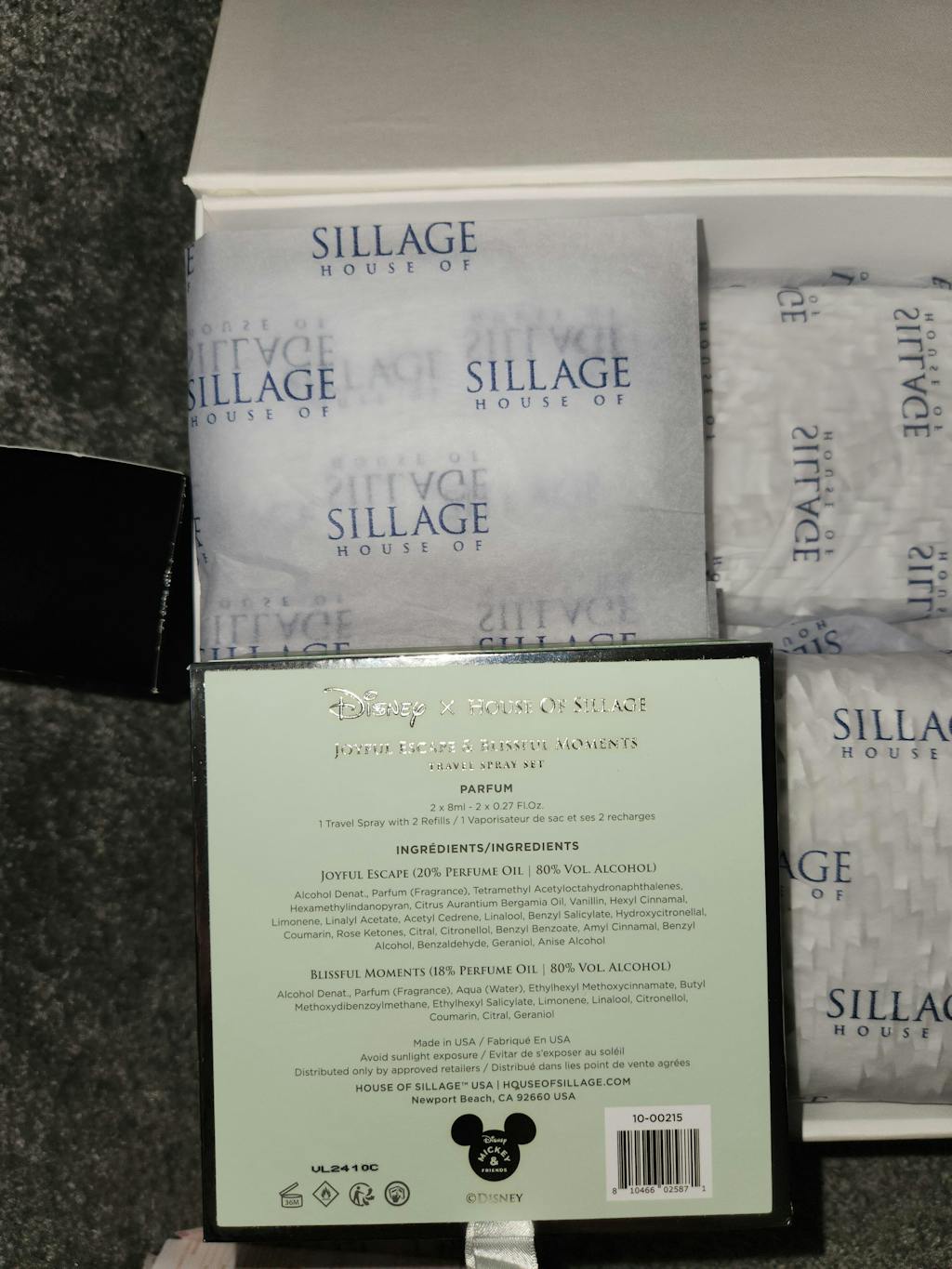 This set features a custom blend of hand painted, enamelled travel spray case presented in a playful Mickey & Minnie print. This case perfectly fits any House of Sillage travel spray parfum refills (8mL).